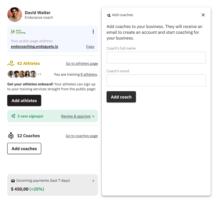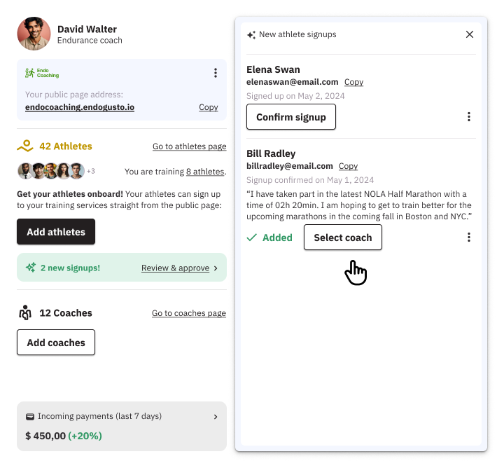 Designed to address your business needs, our endurance coaching platform includes integrated payments, a branded subdomain, and the capacity to add coaches, ensuring you can keep your high-quality services while growing your business.