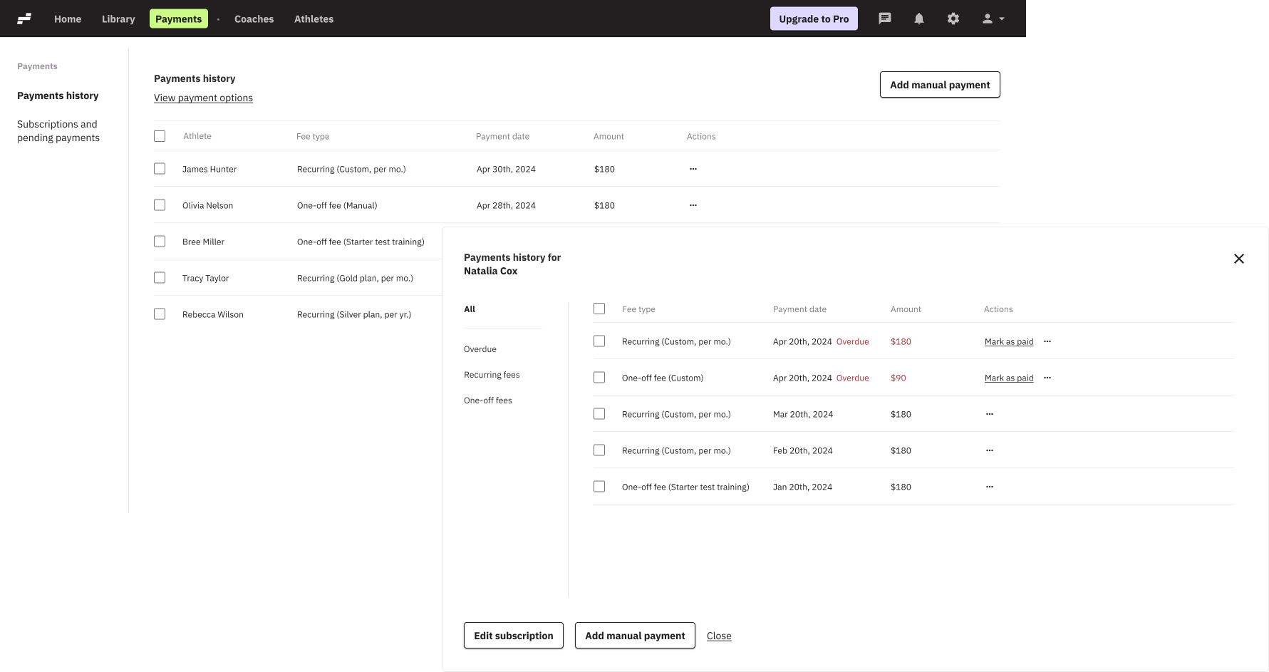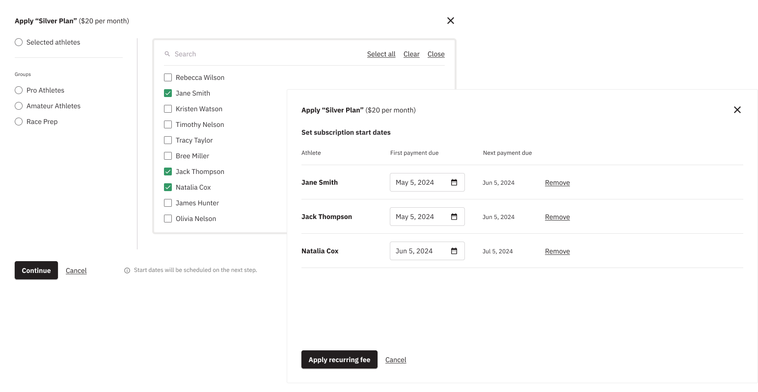 Apply personalized payment plans to individual athletes, or groups of athletes, depending on the level of service they have purchased from you